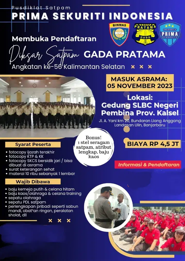 DIKMEN SATPAM GADA MADYA POLDA KALIMANTAN SELATAN Syarat Peserta: Fotokopi ijazah Gada Pratama Fotokopi ijazah terakhir Fotokopi KTP dan Kartu…